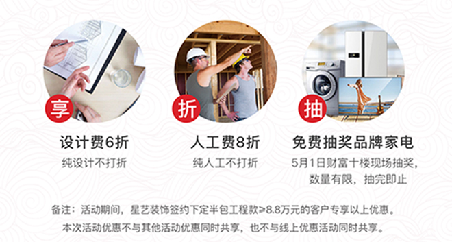 在這裝修的最好時(shí)節(jié),星藝裝飾開(kāi)啟裝修狂歡季,帶來(lái)了多重優(yōu)惠豪禮。設(shè)計(jì)費(fèi)6折,人工8折,活動(dòng)現(xiàn)場(chǎng)可參與砸金蛋抽取品牌家電,100%中獎(jiǎng),。從設(shè)計(jì)到施工,您要的優(yōu)惠,盡數(shù)奉上。
