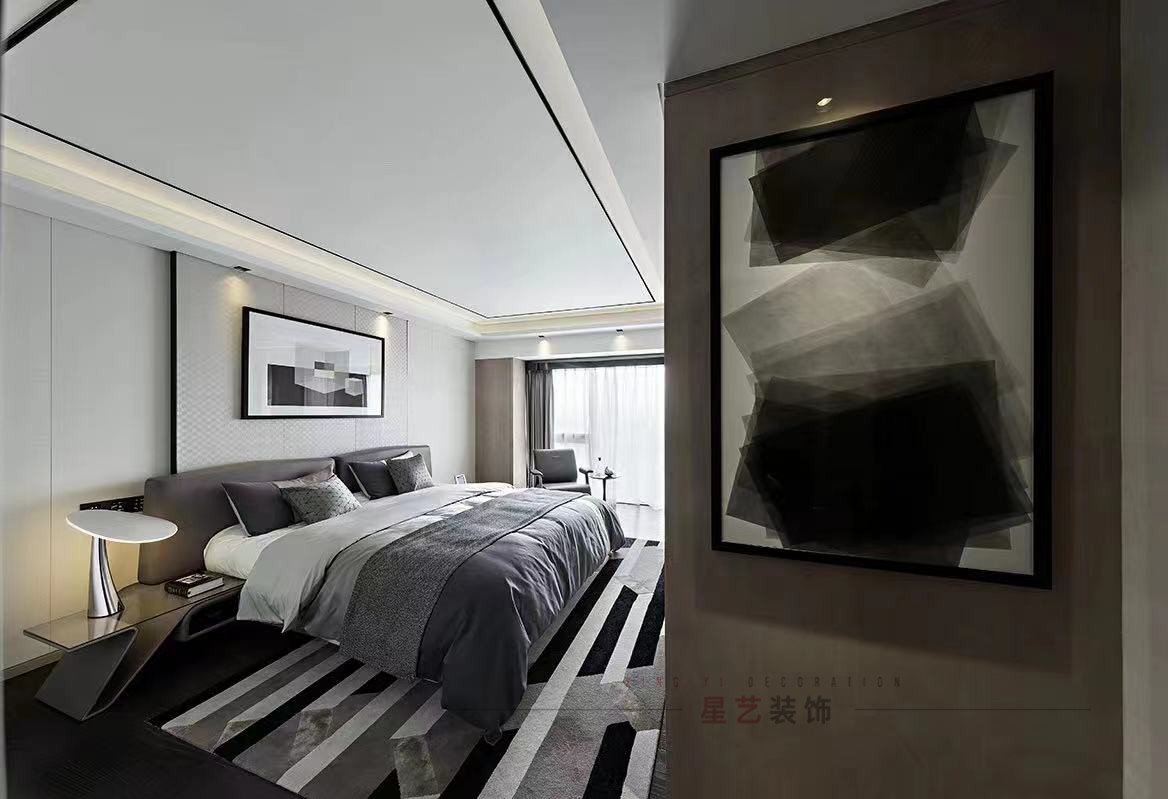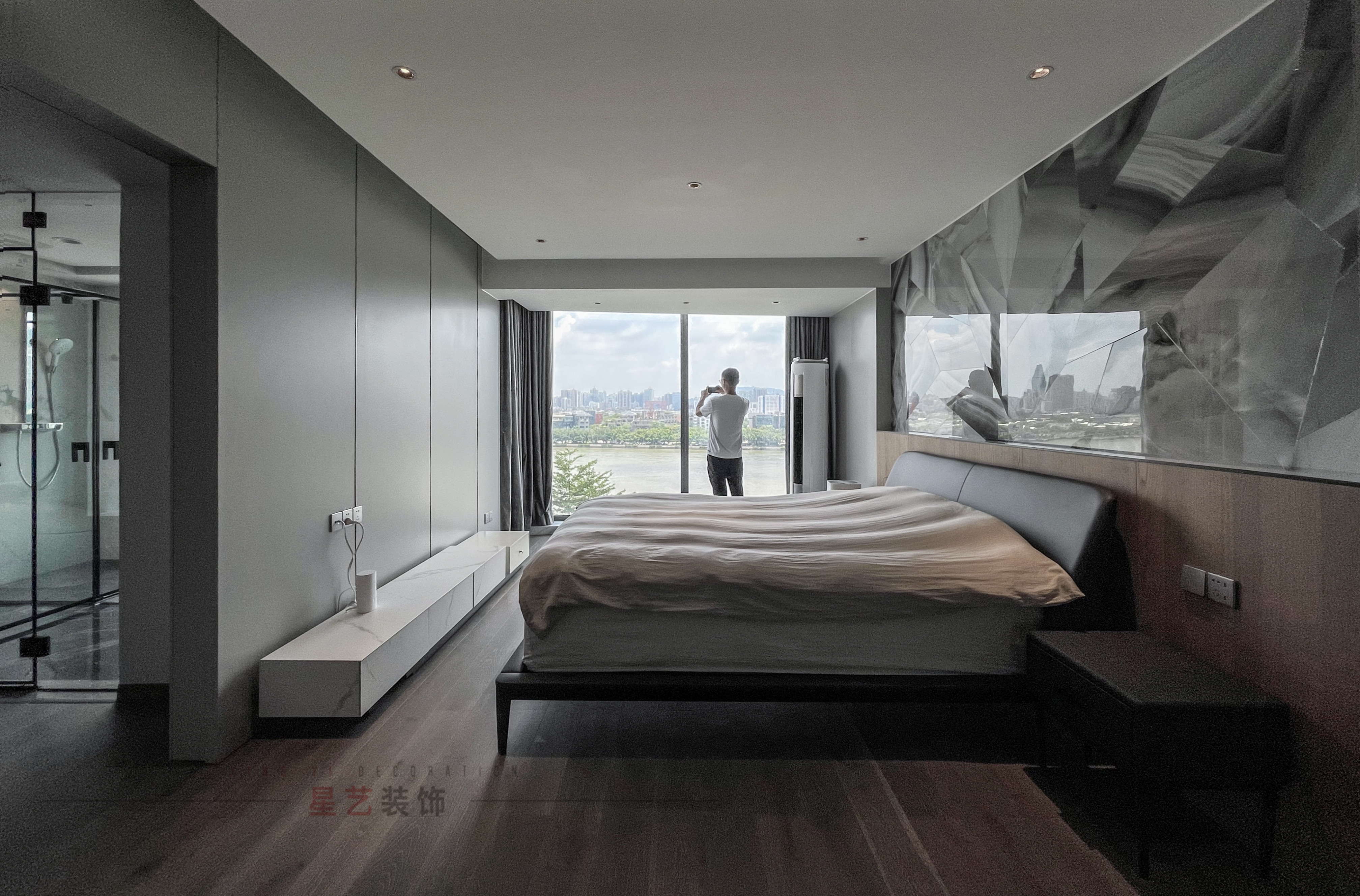 主臥主要打造一種平和靜謐獨立空間,利用極佳的地理優(yōu)勢,在站在落地窗前每天都能看到不一樣的珠江風景,視野開闊。床頭上坊還有玻璃碎片拼圖,不需要太多的裝飾,房間也不會顯得空落落的。
