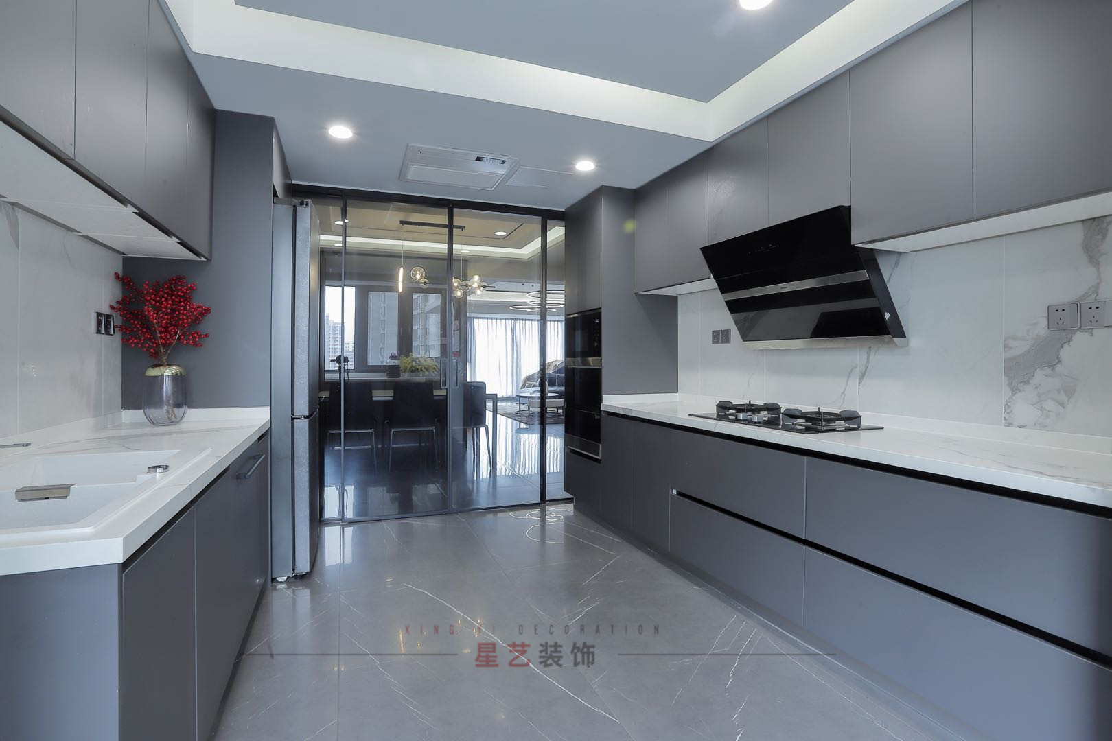 廚房部分是最能體現(xiàn)空間感的地方,白色的大理石臺面搭配灰色的收納櫥柜,簡約而不失高級感,透明的移動玻璃門和黑邊的修飾都很好的協(xié)調了大面積灰色帶來的沉悶感。