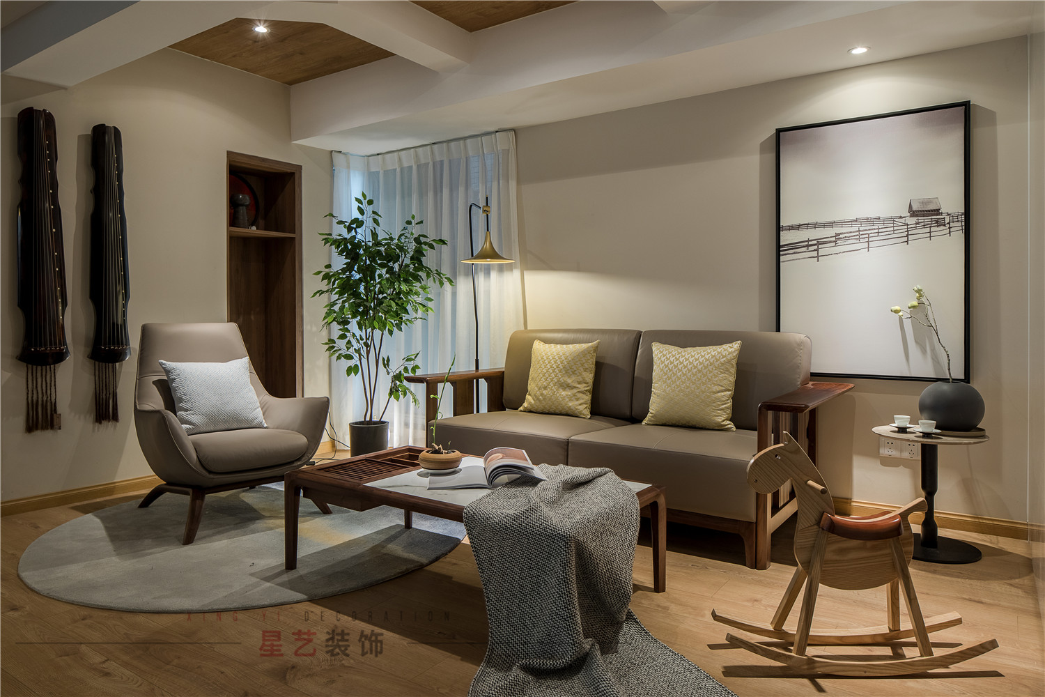 因?yàn)榭蛷d的實(shí)際采光是比較弱的,所以設(shè)計(jì)師就以以局部光源為主,營(yíng)造燈光氛圍,天花板用假梁的元素變中和了原來(lái)雜亂低矮的梁,減少空間的壓抑感。