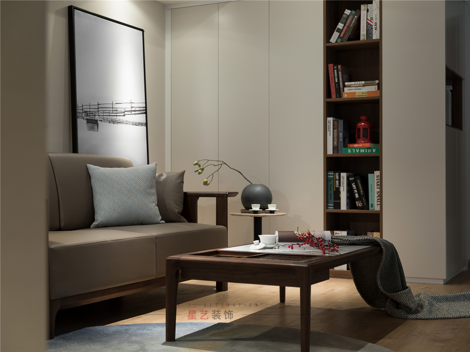 旁邊就是超大的書柜,搭配綠植盆栽和墻上的茶壺?cái)[件,讓這個(gè)角落充滿書卷氣息,一家人一起學(xué)習(xí),一起成長(zhǎng),溫馨而美好。