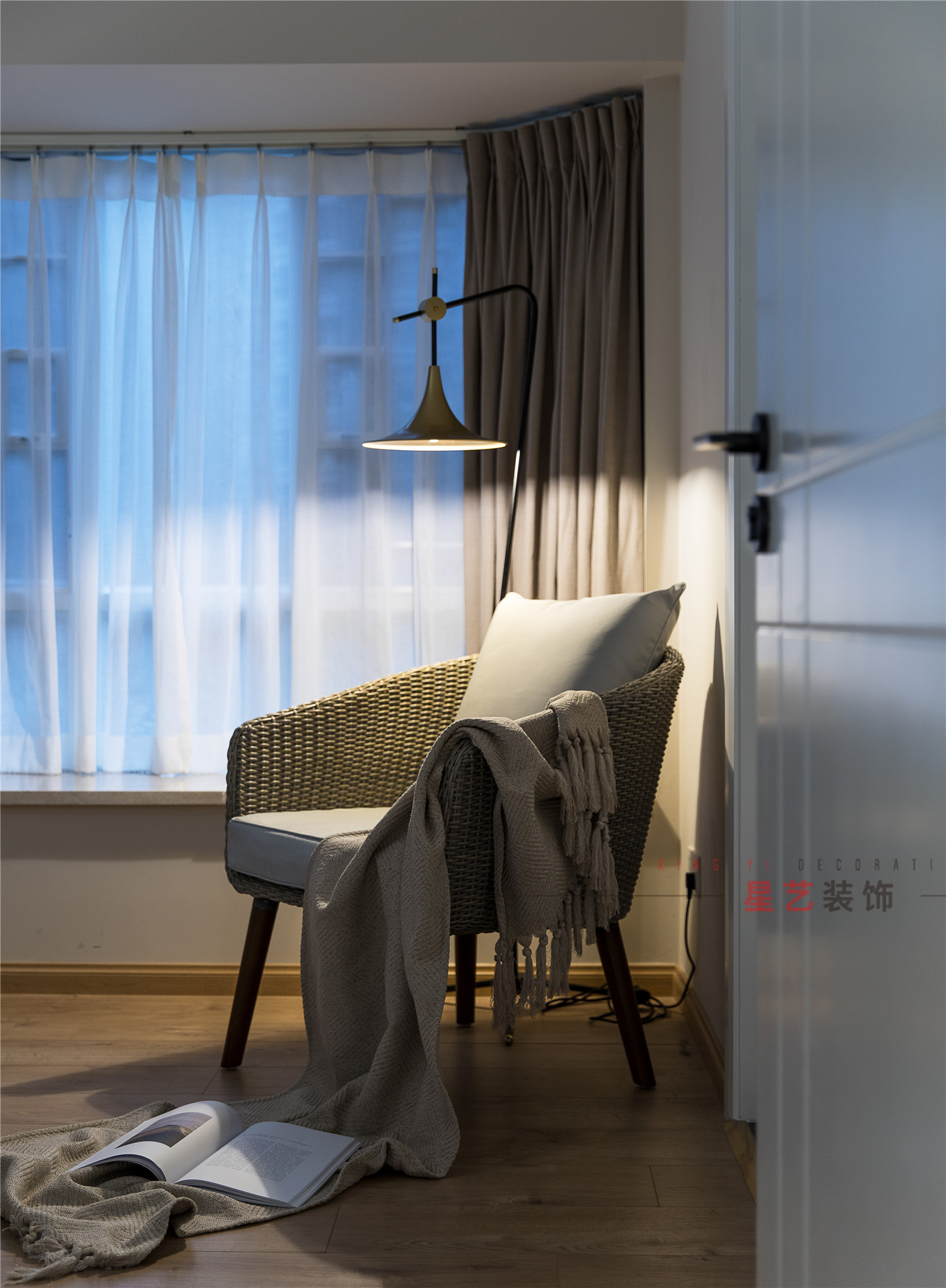業(yè)主平常非常喜歡看書,提高自身修養(yǎng),所以設(shè)計(jì)師特地在兩邊床頭位置設(shè)置了小書柜,回家后也可以在窗邊的藤椅上休息,看太陽(yáng)落山,日暮降臨,沉浸在自己的小世界里,以最好的狀態(tài)迎接每一天。