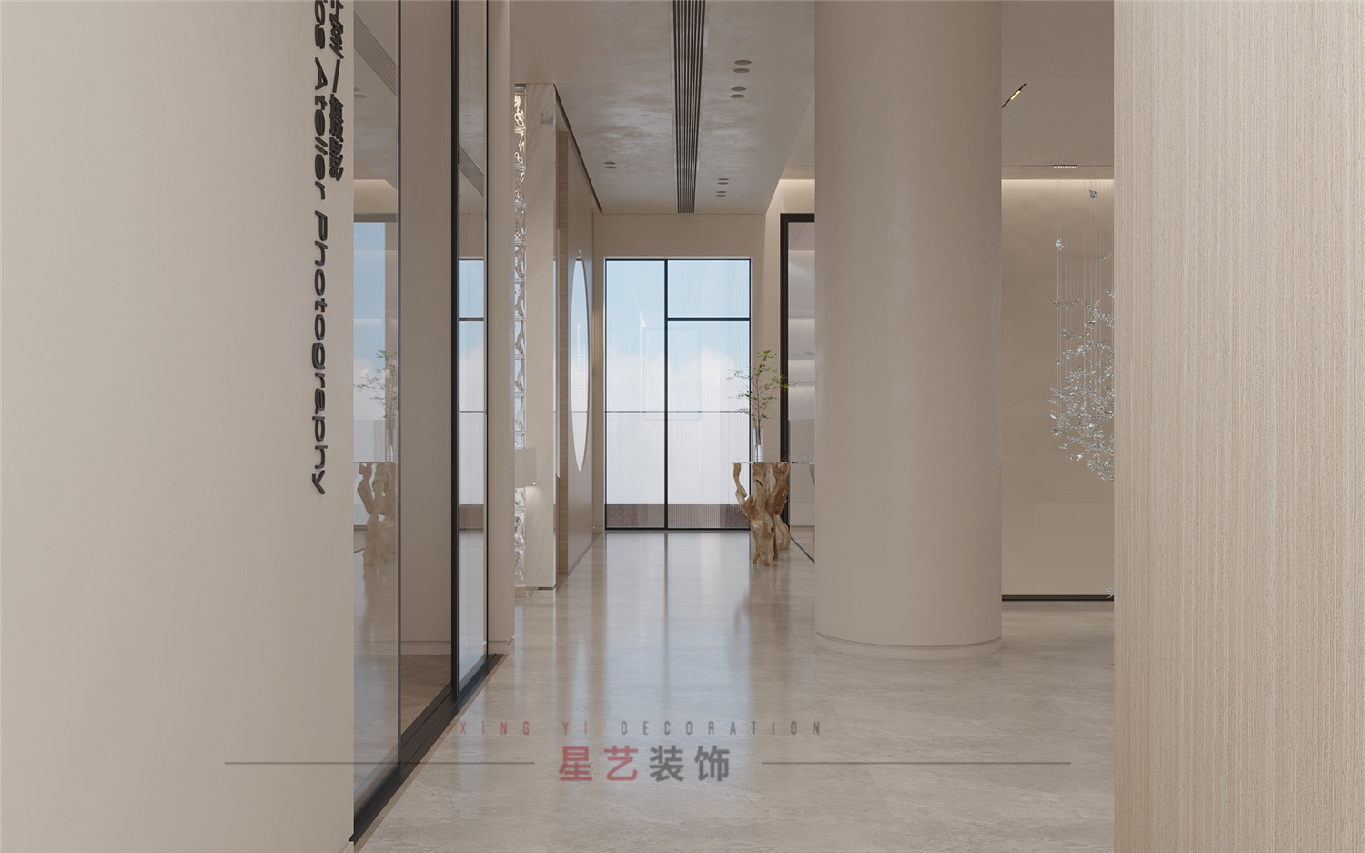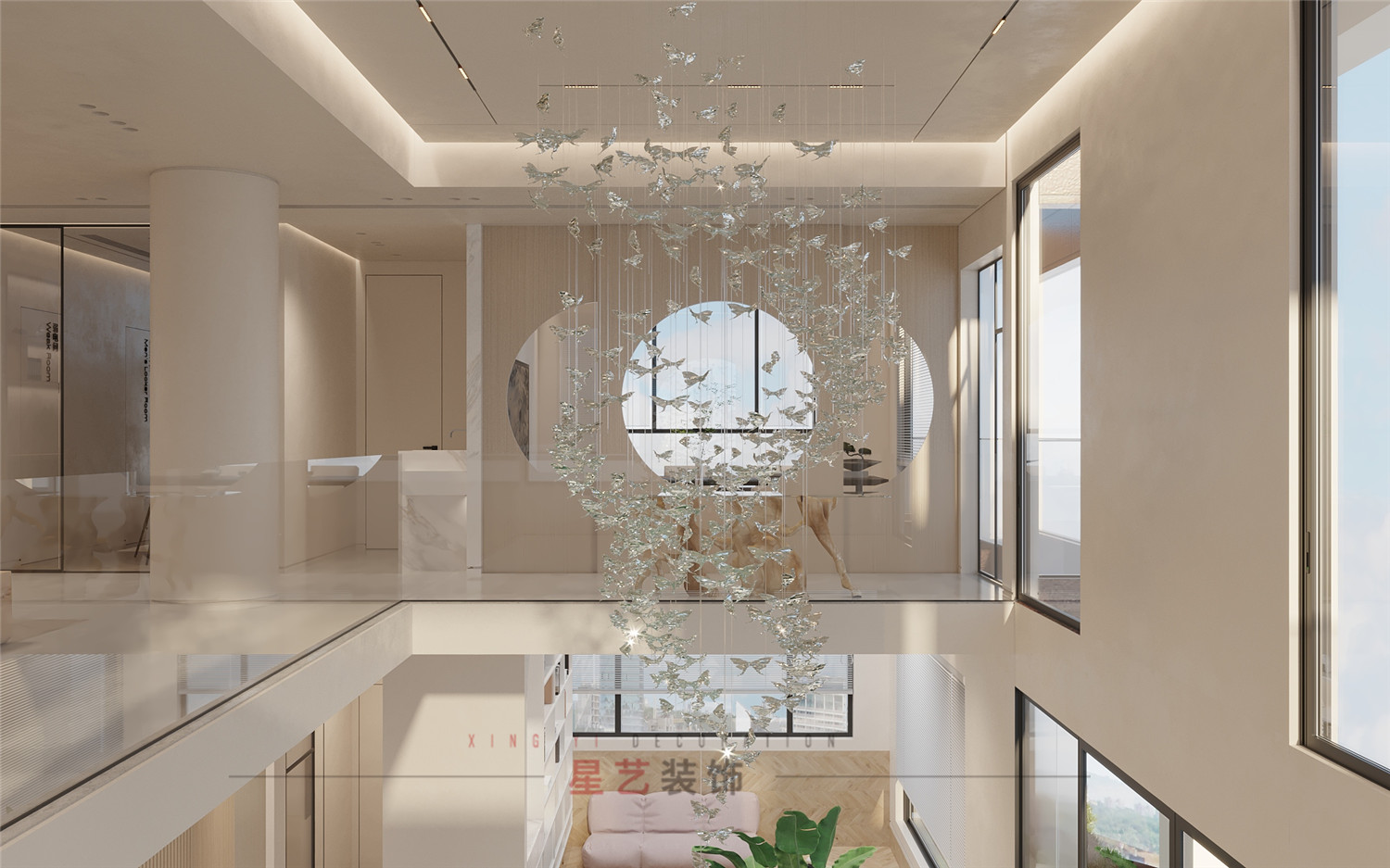 二樓大廳兩根圓柱讓整體空間有了重心, 搭配透明玻璃圍欄互補兼容。水晶吊燈上的蝴蝶栩栩如生,與遠處的圓窗形成絕美的畫面,像是進入愛麗絲仙境般夢幻閃亮。