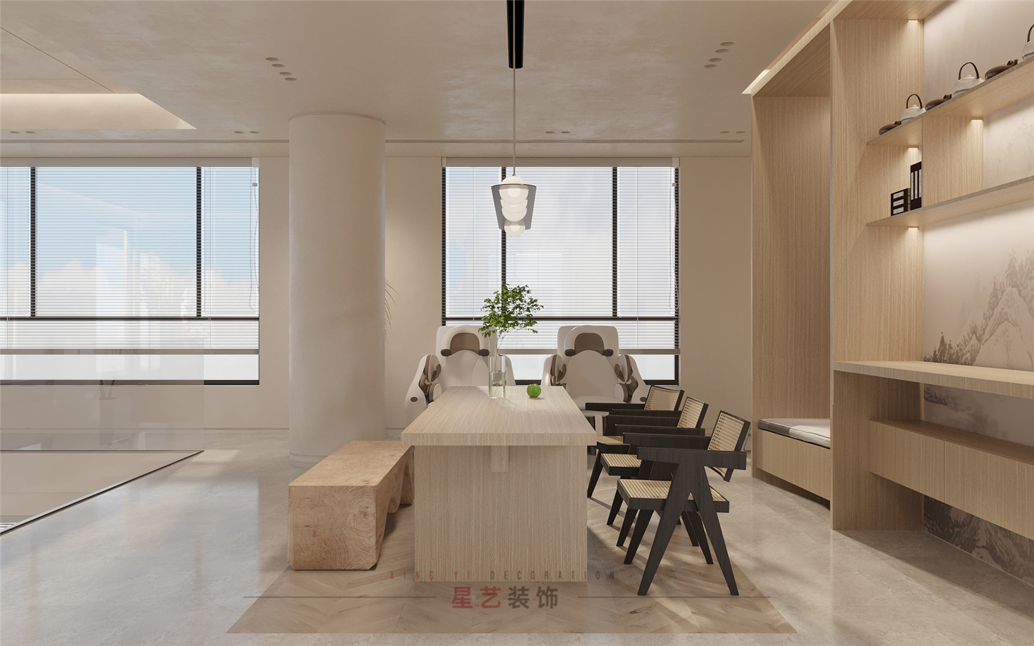 在多種木紋材質(zhì)紋理襯托下,休閑區(qū)呈現(xiàn)出寧靜祥和的景象。風和日麗的下午,一杯茶,一份陽光,足矣。