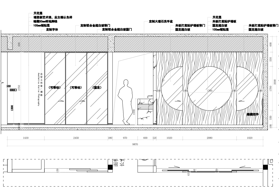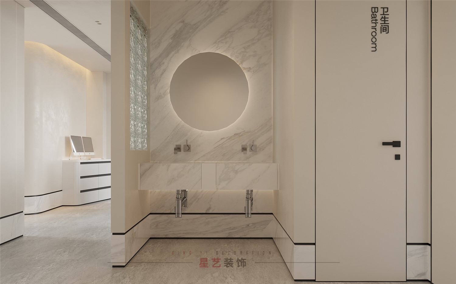 過道處設有衛(wèi)生間,洗手臺,便捷舒適。墻體與玻璃門都有運用大面積枯山水紋路,詮釋深刻的禪宗美學,從而實現(xiàn)“無水而喻水”的效果,強化細節(jié)體現(xiàn)。