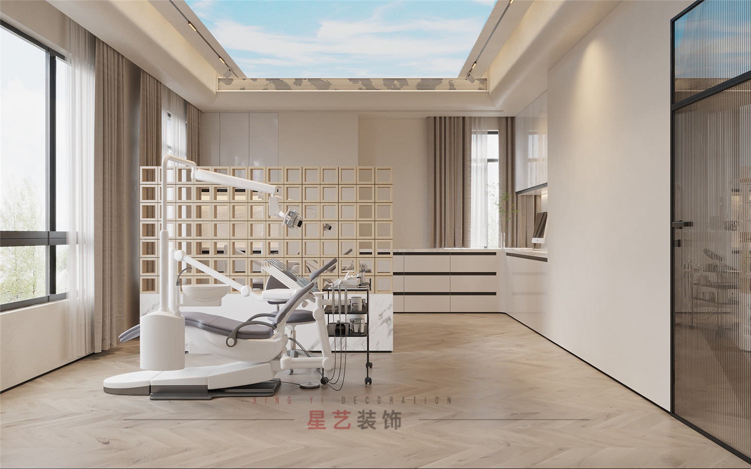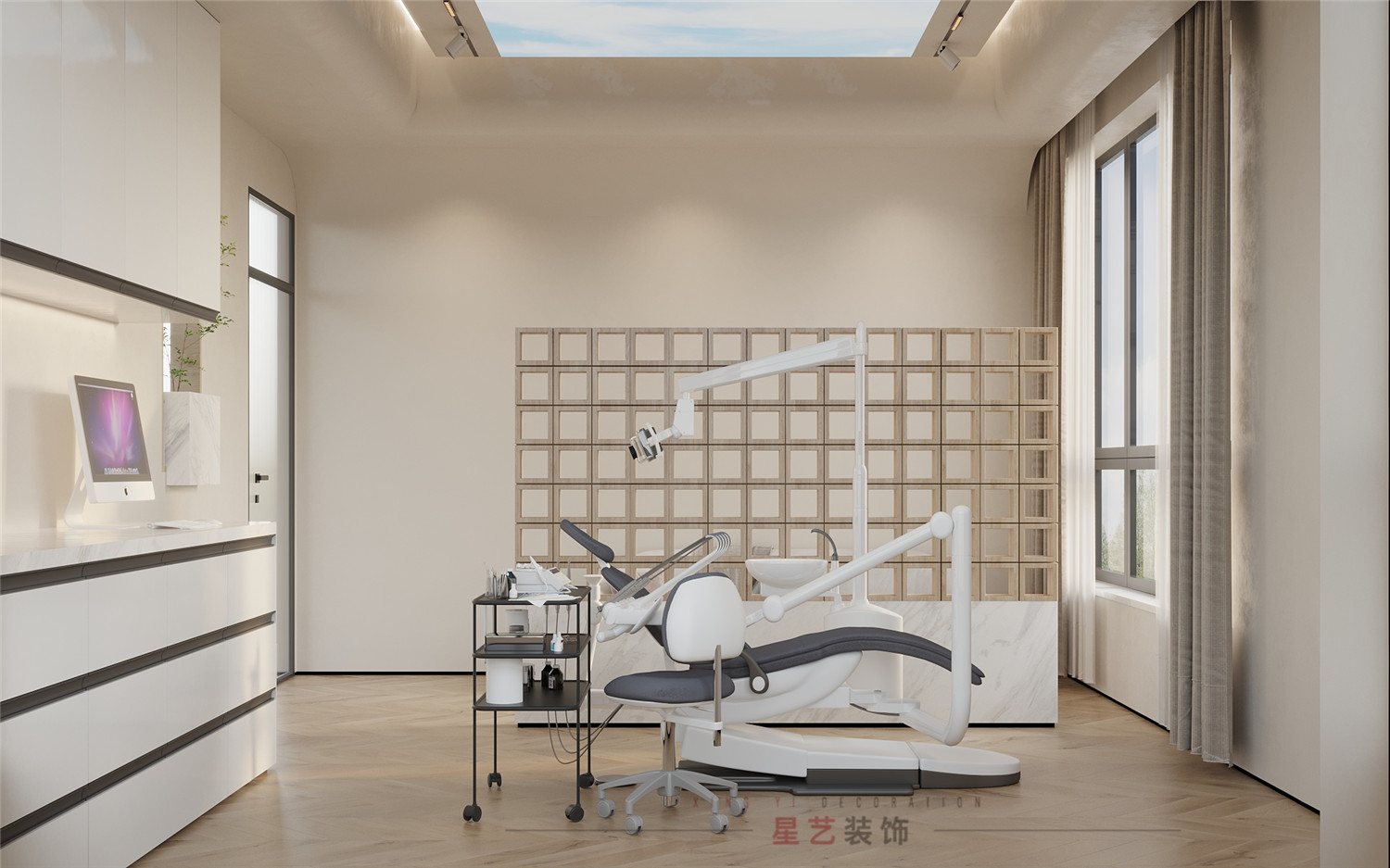 不同功能的診室強調(diào)的是實用性與舒適性。牙科ct室用高級灰+白打造靜謐的獨立空間;種植室和正畸室增加了主機和鍵盤位區(qū)域,主要設備也都正對窗臺,一縷朝陽落下,整個功能區(qū)都呈現(xiàn)出柔和治愈的色彩,忐忑不安的心也慢慢平靜下來。