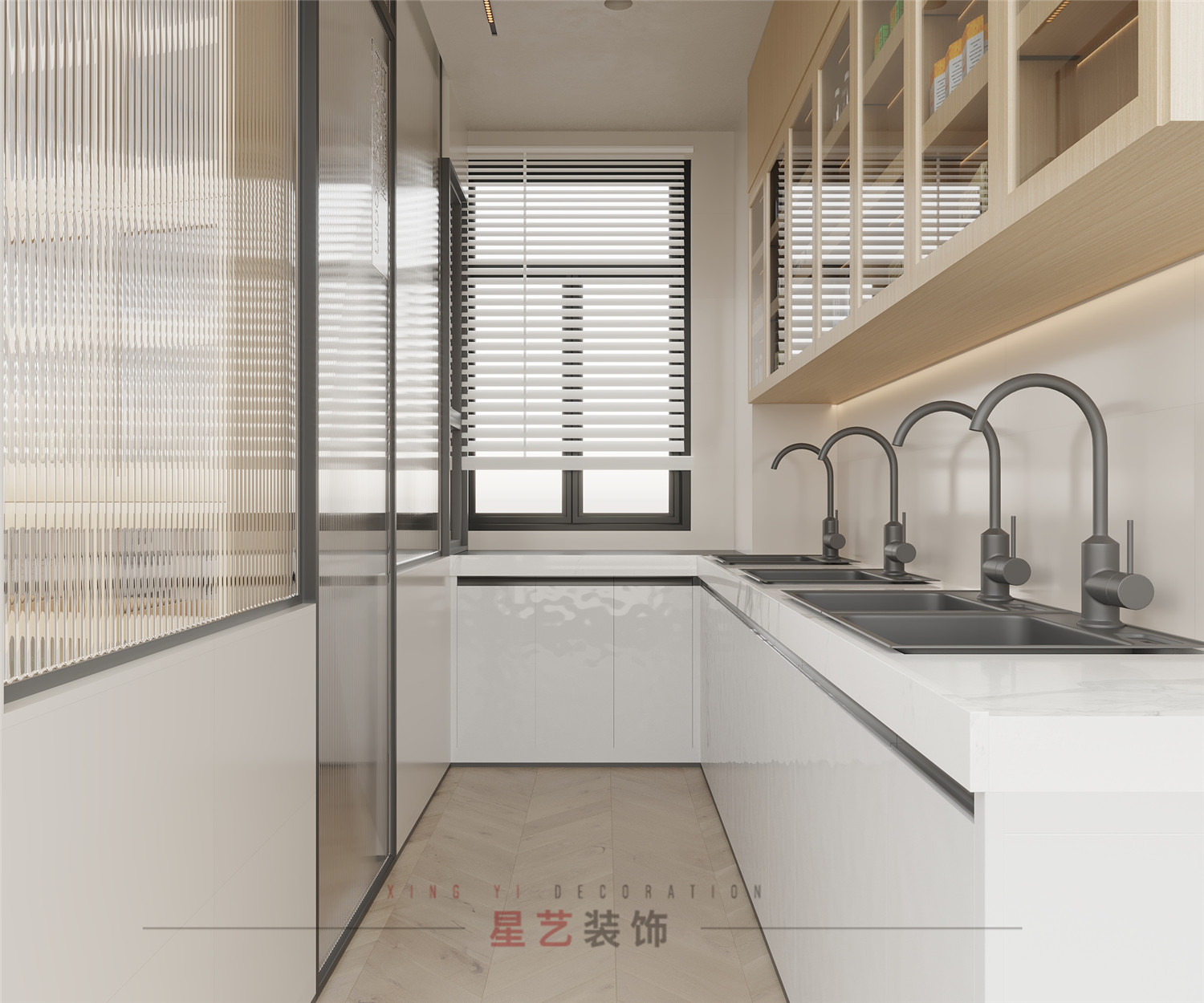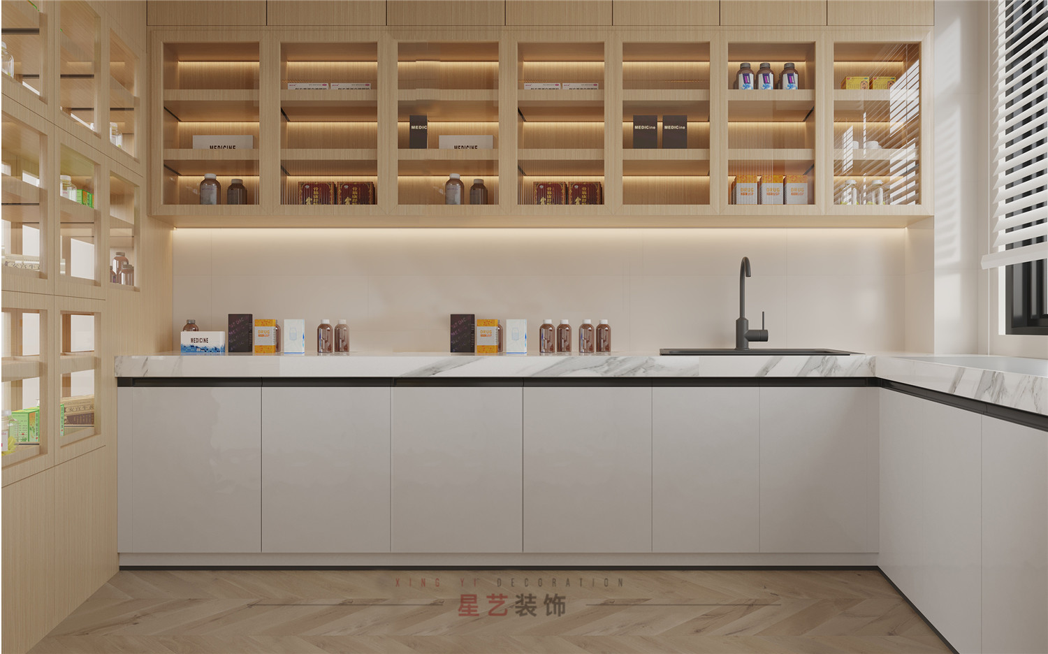 清洗室和消毒室配備了足夠的儲存空間與洗手臺,劃分精準。百葉窗設計使空間更為通透,滿足通風條件。
