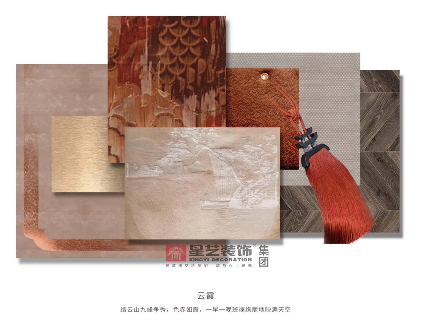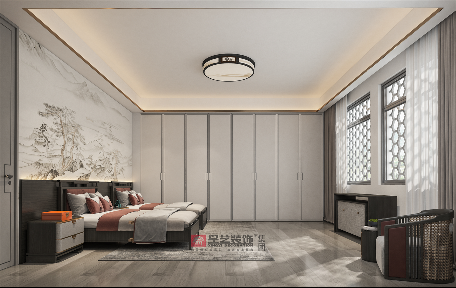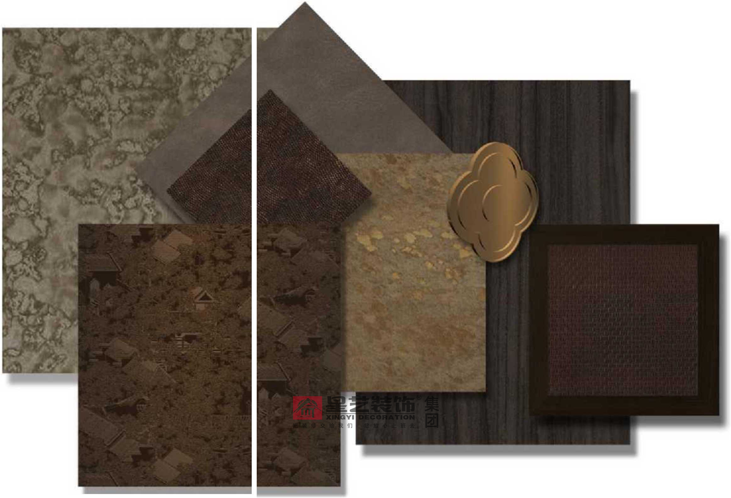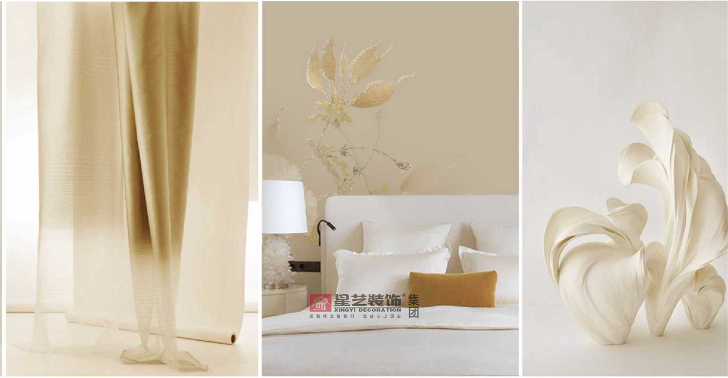 地面采用女主人喜歡的銀杏葉與祥云元素,配上隔斷屏風隔而不斷,即起到風水上的擋煞作用。并以石材原木與金屬為主要材質,把東方氣韻下的低調典雅呈現的淋漓盡致。