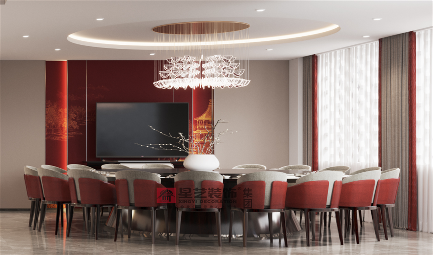 負一層宴會廳采用復古紅與金色為點綴,丹火茜霞,素帛墨香,東方美色,合乎自然。那份悅動與鮮亮直入眼簾,開出最強勁的生命之花,在渺遠的歷史長河里熠熠生輝,留下明清神韻,氣象萬千。