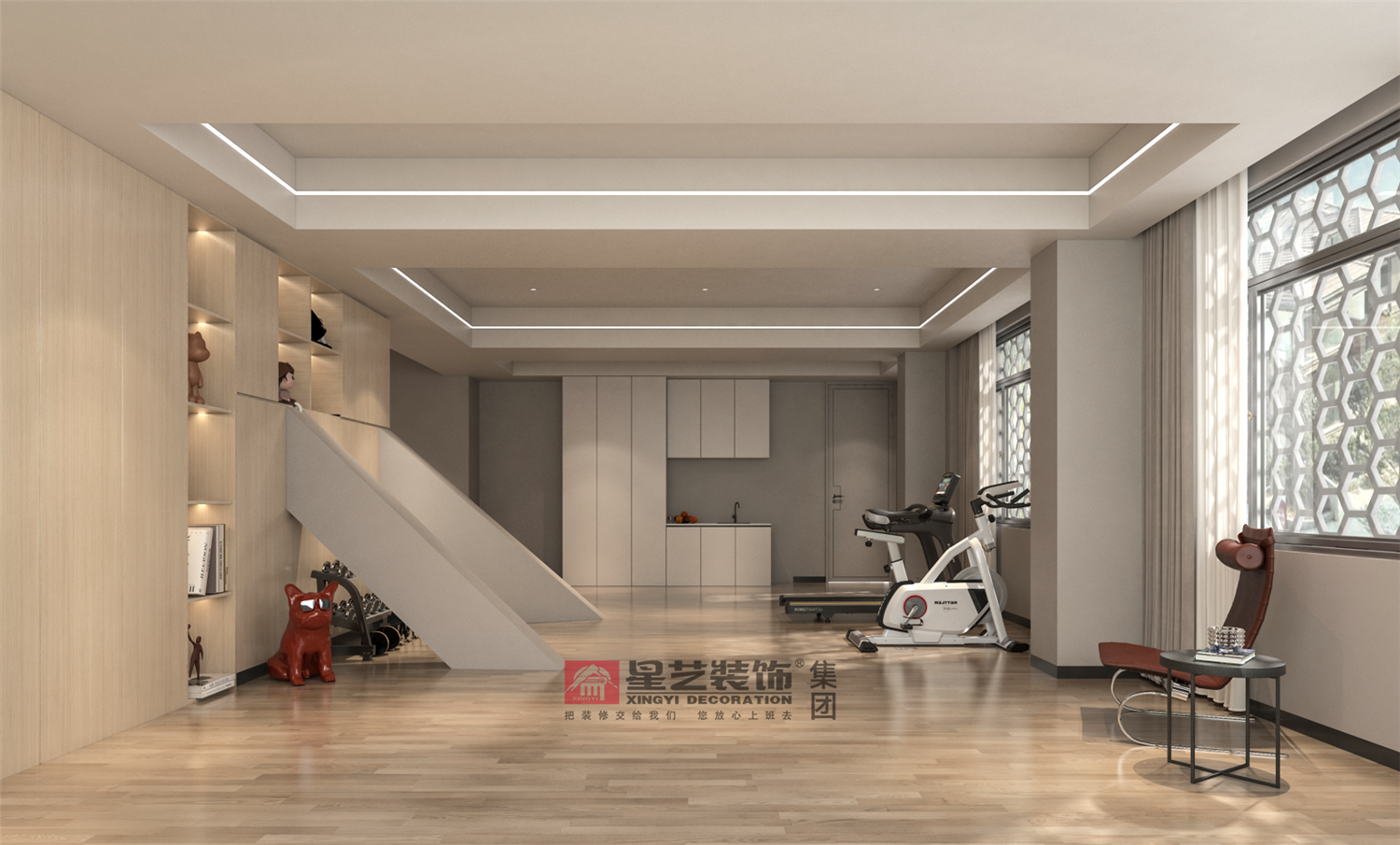 當一股濃濃的寫意水墨氣質注入到輕奢新中式空間中,不僅可以大大提升空間品質,讓東方韻味無限彌散;明亮的健身房配上音樂讓家人在運動互動中尋得快樂。
