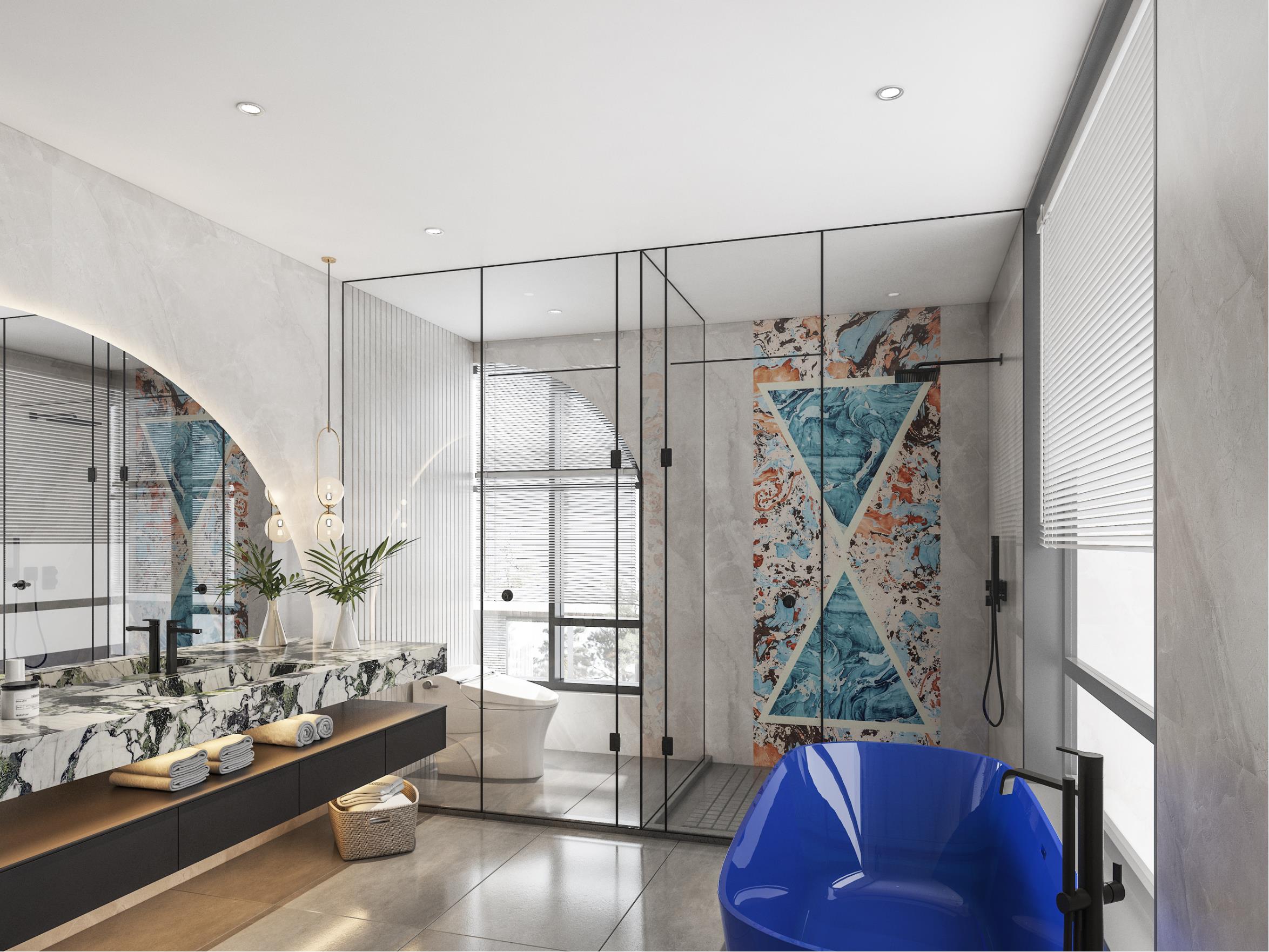 時尚現代的衛生間簡潔而清爽,愛馬仕橙與海洋藍的巖板增加空間藝術層次感。