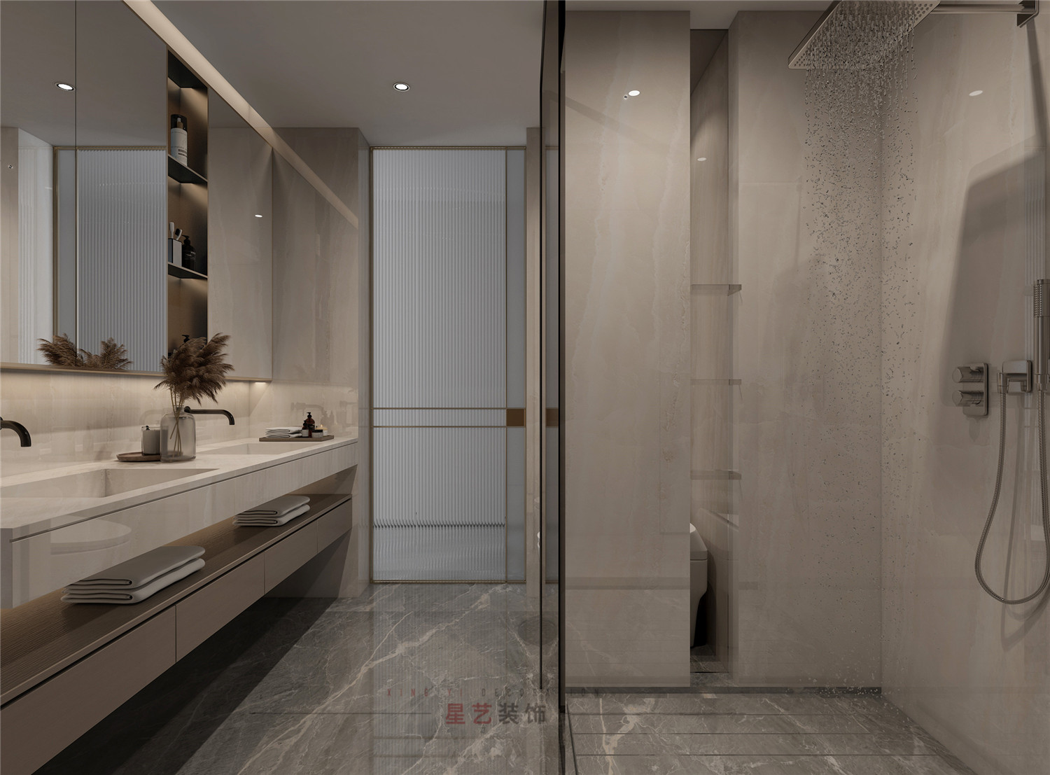 進(jìn)衛(wèi)生間,水池下方的壁龕設(shè)計可以放置換洗衣物或日常洗浴用品,整潔自然