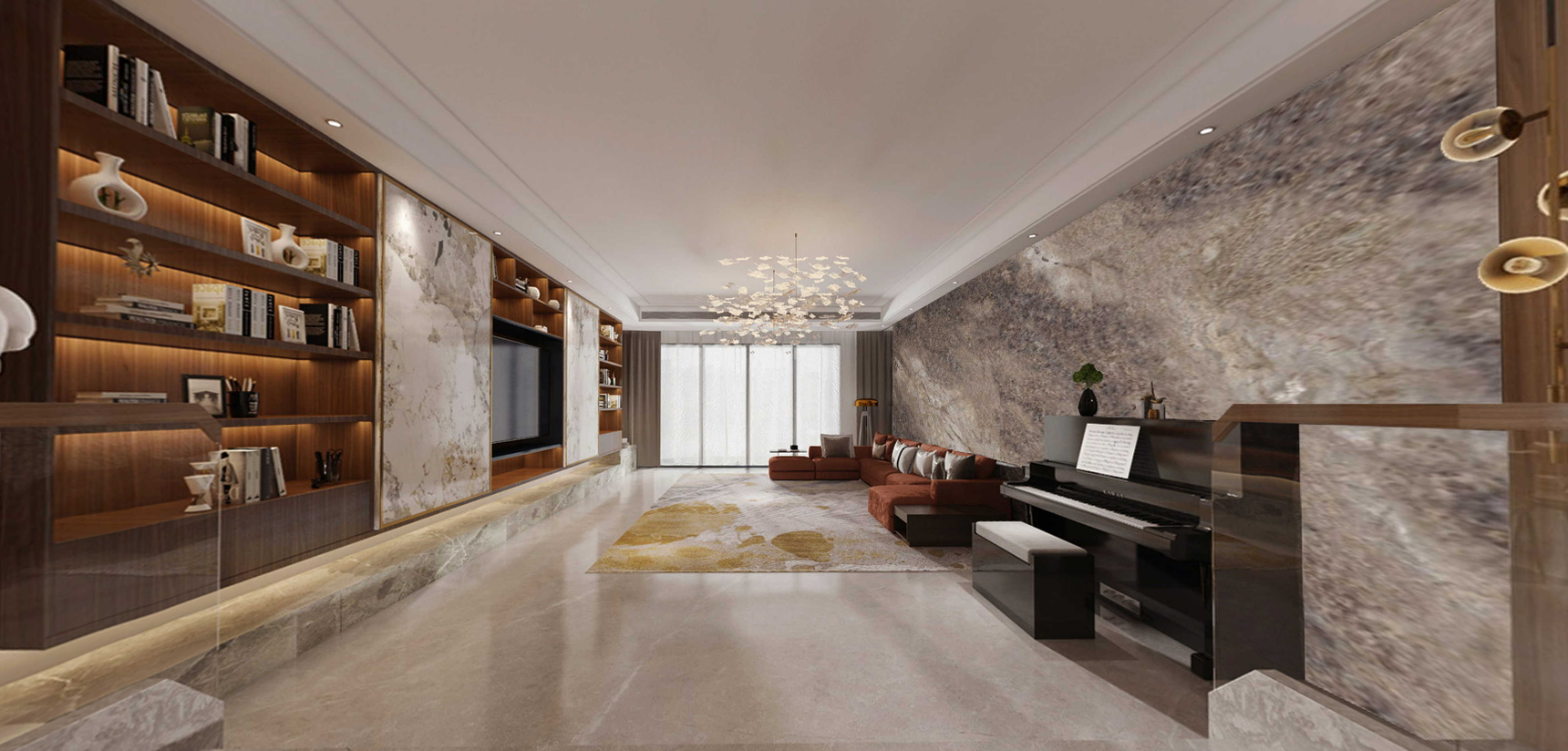 全屋以原木風為主,胡桃木色的墻板搭配奢石巖板,同色系的組合式廳柜+L型沙發(fā),將生活場景娓娓道來。
