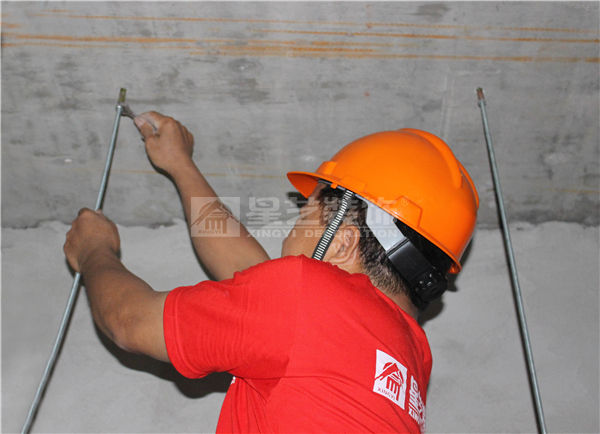 A、吊桿固定:沿主龍骨彈線位置,用沖擊磚打孔安裝頂爆固定吊桿。